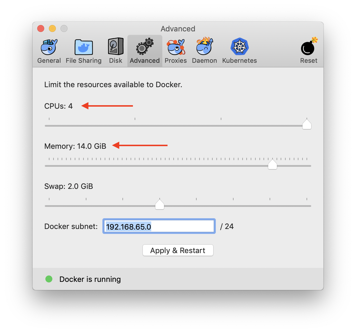 By default, Docker will limit the memory usage to 2 GB. Given that most Bioinformatics workflows are computationally intensive, some of the tasks may require a higher memory usage. To change the memory allocation, go to Docker Preferences (Right Click on the docker Icon) -> Preferences -> Advanced, and adjust the memory allocation as needed. We recommend allowing Docker engine to use at least 10 GB of memory or more.